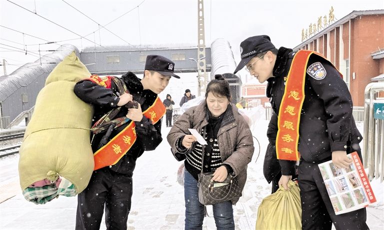 2月21日,呼倫貝爾免渡河站派出所民警堅守春運(yùn)一線,主動為旅客搬運(yùn)行李,用暖心行動守護(hù)旅客平安出行。呼倫貝爾鐵路部門緊扣平安、有序、溫馨目標(biāo),積極應(yīng)對嚴(yán)寒風(fēng)雪天氣,全力保障旅客出行順暢。草原云·正北方網(wǎng)記者 李新軍 攝